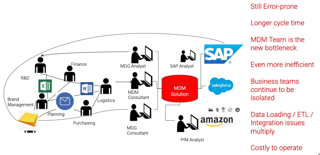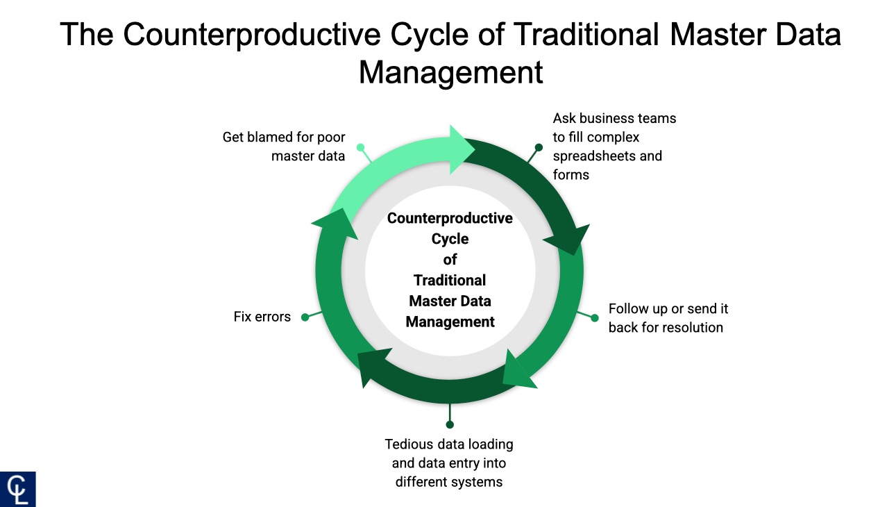 The counterproductive cycle of traditional master data management is shown below. It includes asking business teams to fill out complex and confusing spreadsheets and forms, chasing them for input, tedious data entry, fixing errors, and being blamed for poor master data.